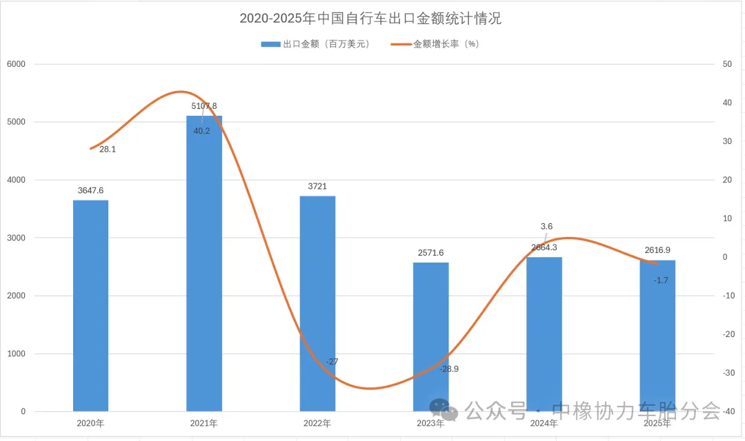 从金额方面来看,数据显示,2025年1-12月中国自行车出口金额2616.9百万美元,同比下降1.7%。