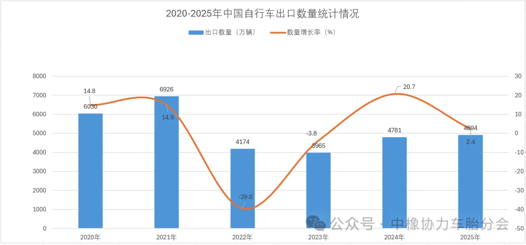 2025年1-12月中国自行车出口数据统计分析据最新数据显示,2025年1-12月中国自行车出口量4894万辆,同比增长2.4%。